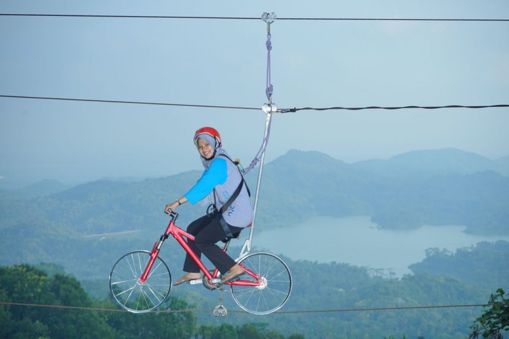 Uniknya dari spot foto ini adalah dimana orang yang biasanya menggunakan sepeda itu di jalan, akan tetapi kali ini menggunakan sepeda pada seutas kabel baja yang berada di ketinggian. Oleh sebab itu spot ini disebut dengan sepeda langit.